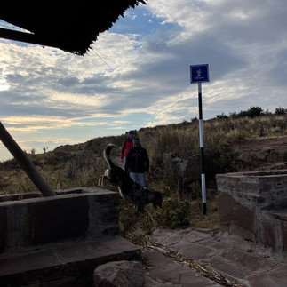 Our guide lead us on a village tour and lovely hike up to a pre-Incan burial chamber, with lovely views of lake Titicacca. Ambling through the square past the church with original Spanish bell tower we followed the bay before ascending. Agricultural terraces from pre-Incan times everywhere; some farmed others abandoned. Deciding the agricultural lesson was not for me I forged ahead, accompanied by another local dog taking a shine to me! Almost there we saw hares and an eagle soaring, hovering, riding the thermals; quite special.