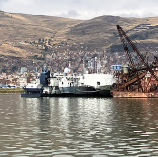 (Puño dock; original ships, oldest middle brought in pieces from UK, 3years to assemble, plus dredger; highest steamers in the world; Puño; Puño dock; shores of Titicacca; our capitán's instrucate knitting; our captain)