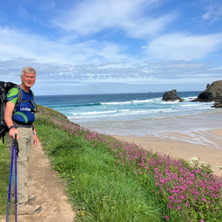 A brisk easy downhill lane with wonderful Cornish wild flower hedges lead back to Porthcothan beach. We rounded the clover strewn moorland headland, in bright sunshine, seeing Bedruthan steps; the Victorian’s Cornish giant’s stepping stones! The path then literally vanished due to the 2021 cliff erosion. Drizzle found us enjoying a welcome cream tea at Mawgan Porth, sheltering from the ensuing deluge.