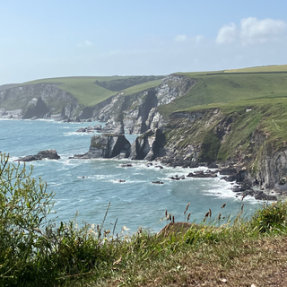 On seeing the waves at the Erme river mouth, it was obvious why there was no ferry! Skirting the occupied nudist beach we climbed onto the headland to great views, crashing waves and blustery winds. A much tougher, narrow path with many steep ascents and descents, around the headlands and rugged coves lead us to Challaborough with Burgh island dominating the horizon.