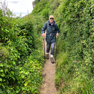 A delicious lunch avoiding drizzle at the beach cafe over, donning waterproofs we all climbed across the wooded then exposed chalk 1790 landslide at Hooken hill up to the cliff top before descending easier grassy slopes through a caravan park down to Beer harbour. Probably a bit too arduous for your 82 year old dad!