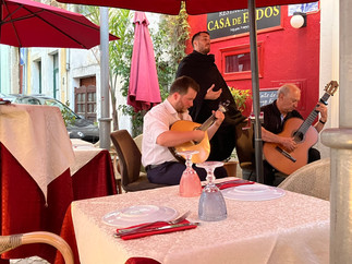 Crossing the river we wandered through the parched park, past the multi-sport event taking place sharing the cordoned path with exhausted triathlon runners, completing their last stretch, back across the iconic foot bridge. Tired, we ate at a tiny Portuguese restaurant behind the hotel. We were treated to highbrow Coimbra fado; male singers in university gowns accompanied by lute and guitar - a much better private performance! An empty restaurant meant we were obliged to consume local cheesecake and enjoy the entire 3 set repertoire!